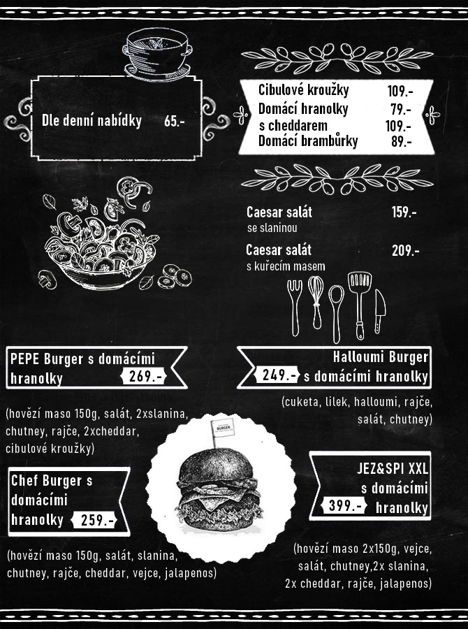 Jsme zaměřeni především na hamburgery a steaky, ale každý týden menu obměňujeme a nabízíme pokrmy ze sezónních surovin. Interiér restaurace se nese v rustikálním stylu.